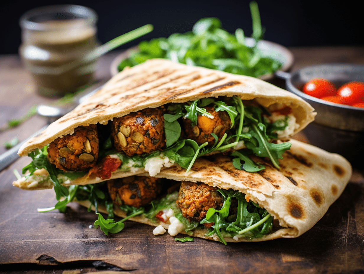 Podlahové chlebové kapsy s falafelem, raketou a rajčatovým chutím 🫓