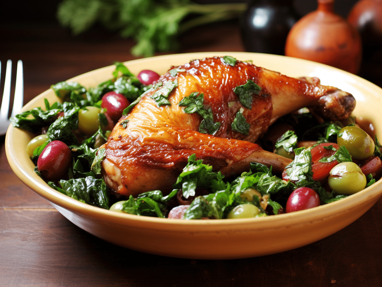 Na každé desce zarovnejte kuřecí nohu na posteli vyrobené z mangoldu. Lžíce na něj teplý hroznový salát nebo vedle něj-sladká a kyselá poznámka se perfektně harmonizuje se silným masem a kořeněnou zeleninou.
