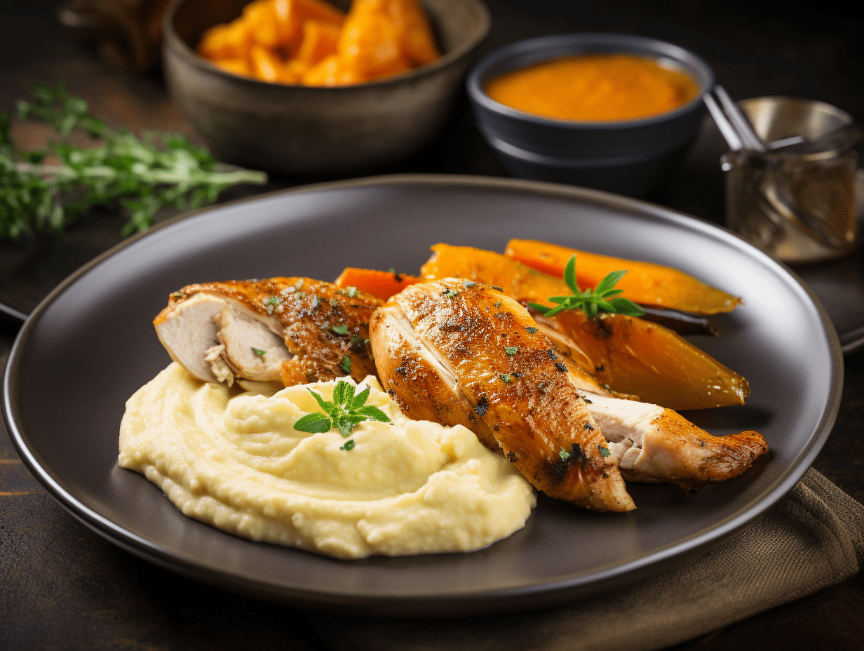 Vyrovnejte krémové mrkvové pyré jako postel na talířích, položte smažené kuřecí prsa na vrchol a ozdobte čerstvou cressem nebo nějakou raketou. Pro něco jiného: pokapejte pár kapek ořechového oleje.